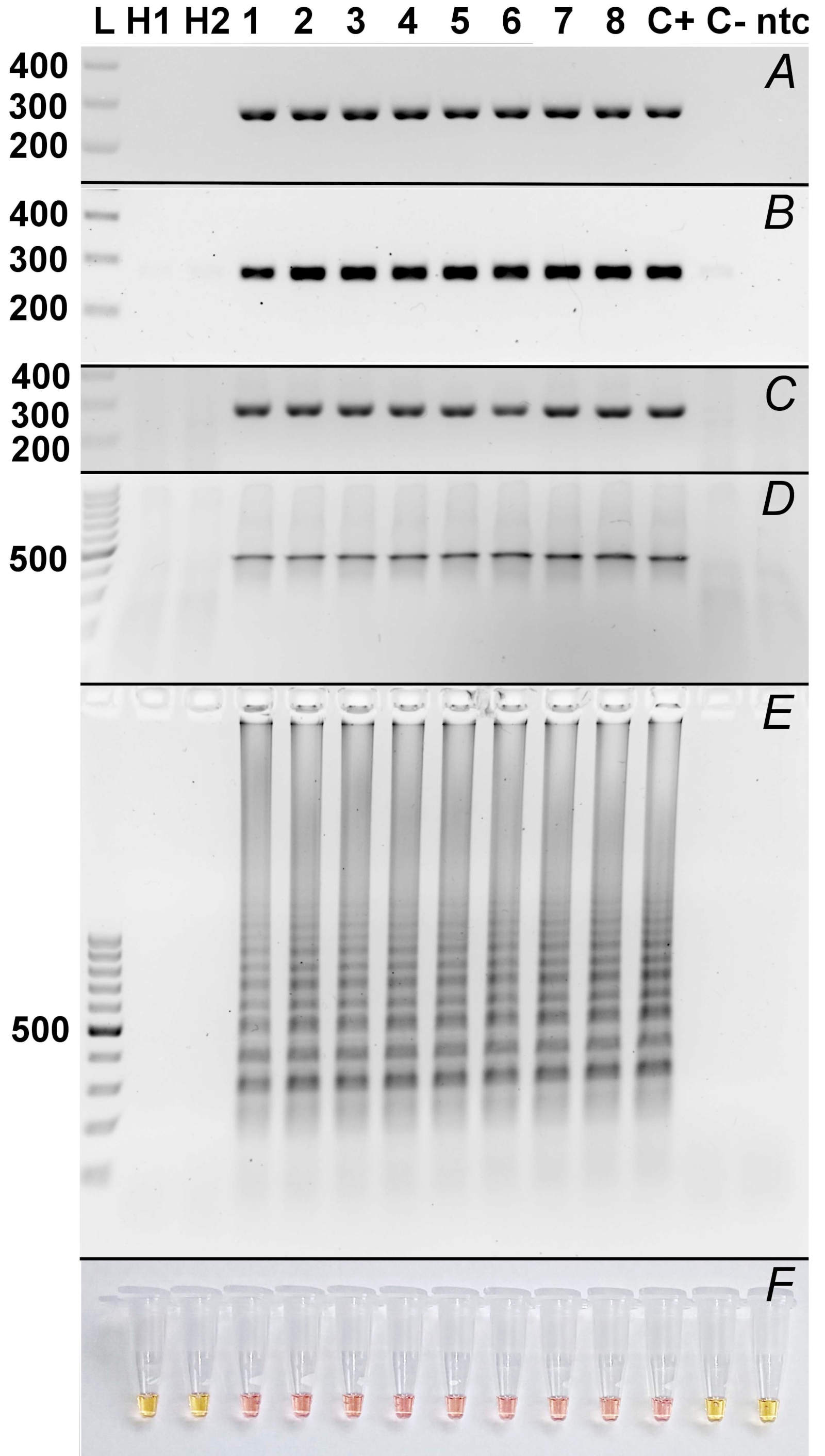 Fig. 2. Comparison of molecular methods used for detection of ToBRFV. A - RT-PCR; B - One-enzyme RTX-PCR; C - IC-RT-PCR; D - Lyo-Ready RPA; E - LAMP; F - LAMP – colorimetric detection using Neutral Red. L: Thermo ScientificTM GeneRuler 100 bp DNA Ladder (Thermo Fisher Scientific, Waltham, MA, USA); H1, H2: healthy plant no. 1, 2; 1 - 8: infected plants no. 1 - 8; C+: positive control (ToBRFV-pDB1α1/PC-ToBRFV/PVX plasmid); C-: negative control (pDB1a1/T7-VNP15-Lime plasmid); ntc: no-template control.