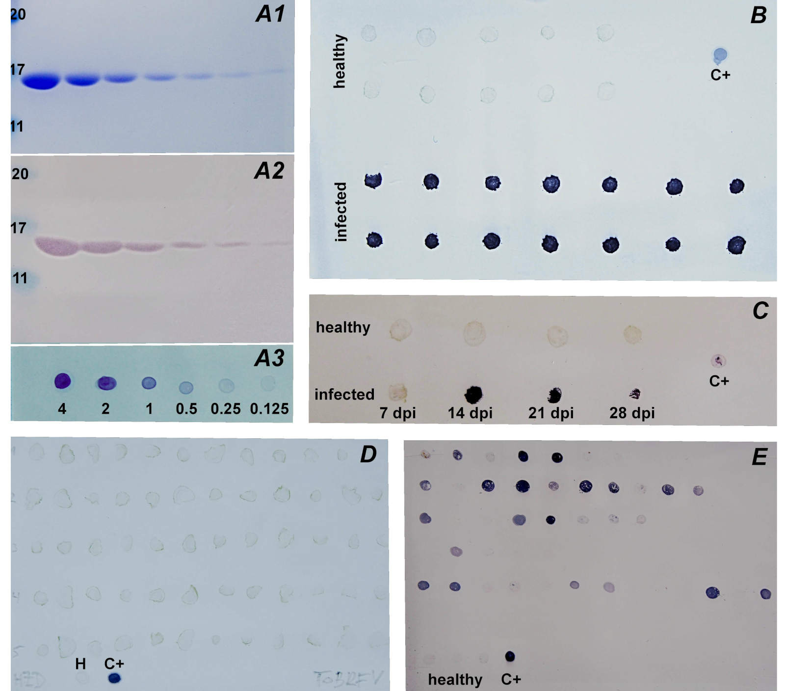 Fig. 3. Protein and immunochemical detection of ToBRFV using anti-ToBRFV antibodies. A - detection of isolated and diluted ToBRFV, numbers below mean amounts of ToBRFV (μg), numbers on the left mean protein size (kDa). A1 - SDS-PAGE/Coomassie Brilliant Blue R-250 detection; A2 - SDS-PAGE/Western blot; A3 - Dot-blot. B - TBIA of healthy and infected tomato plants at 14th dpi. C - TBIA of one healthy and one infected plant at different dpi. D - TBIA of 60 of 73 in total tomato plants grown commercially in Chornice greenhouses. E - Dot-blot of samples of seeds harvested from ToBRFV-infected plants, each individual row represents seeds from one individual fruits. H: healthy plant. C+: isolated ToBRFV (1 μg).