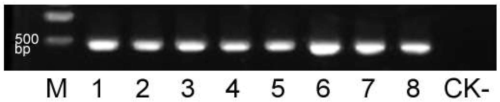 Fig. 4. RT-PCR detection of ToBRFV in single tomato seeds. M: DNA marker (Trans2K Plus DNA Marker, Beijing Quanshijin Biotechnology Co., Ltd., Beijing, China); lanes 1 - 8: individual seeds harvested from ToBRFV-infected tomato plants; CK-: seed from a healthy tomato plant.