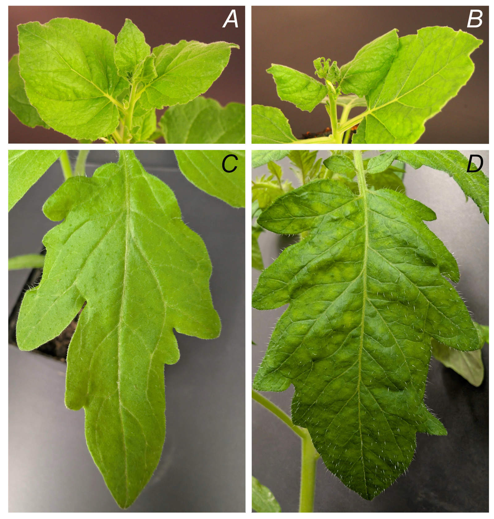 Fig. 1. Symptoms of ToBRFV. A - healthy N. benthamiana, B - infected N. benthamiana (14 dpi), C - healthy tomato cv. Gallant; D - infected tomato cv. Gallant (21 dpi).
